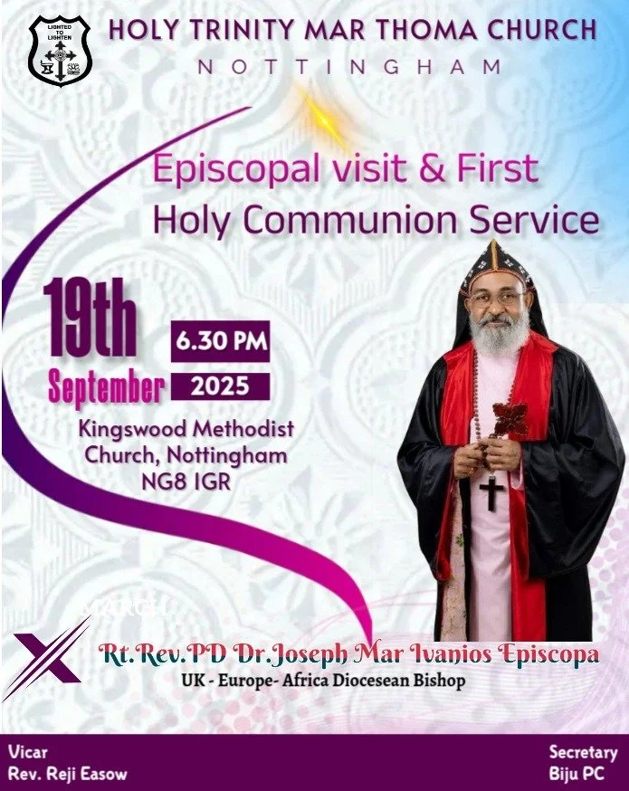 We are extremely honoured to announce the inauguration of the Nottingham Mar Thoma Congregation on Sunday 14th April, at 5.30 pm in Grangewood Methodist Church, NG8 2SJ. This occasion will be graced by our beloved diocesan bishop, Rt. Rev. Dr. Joseph Mar Ivanios Episcopa who will be the esteemed celebrant administering the Holy Qurbana and the First Communicant Service.